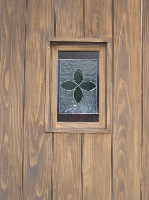 木の羽目板+ステンドガラスの小窓で外観にも変化をつけてみました。