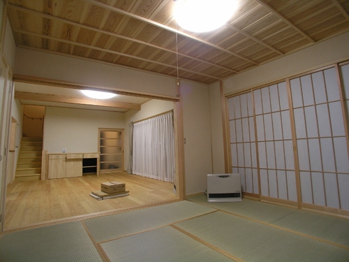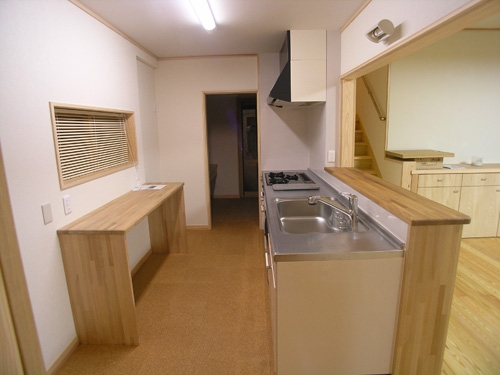 杉無垢の床。珪藻土の壁。洗面、台所などはコルクで仕上げました。