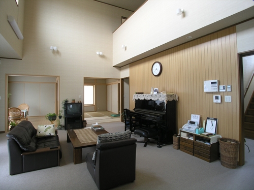 広い庭があるこの建物は、季節の彩りを満喫できる建物。 居間には大空間の吹き抜けがあります。 この吹き抜けに面した2階廊下部分には、吹抜けに合わせた間口のカウンターテーブルを取付。2階で作業しながらも家族の対話が可能です。 和室、寝室、子供部屋。各自のプライバシーを確保し、いつでも団らんの場が建物の中心にある家・・・・。 いかがですか?