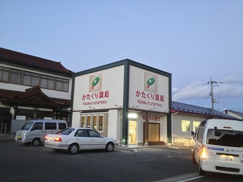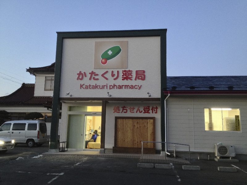 一関の"かたくり薬局"です。 増改築により、インパクトのある外観に生まれ変わりました。 遠方からも確認でき、内部には吹抜け、天窓のある開放的な空間に・・・・ 家具により出窓や陳列棚も工夫し、お客様が利用しやすくなるよう配慮しました。